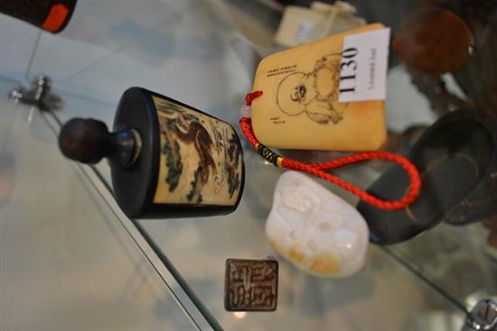 FOUR CHINESE ITEMS INCL. BRONZE SEAL, BONE INSET WOODEN SNUFF BOTTLE WITH SQUIRREL ETCHING, BONE LUCK BUDDHA PLAQUE ETC