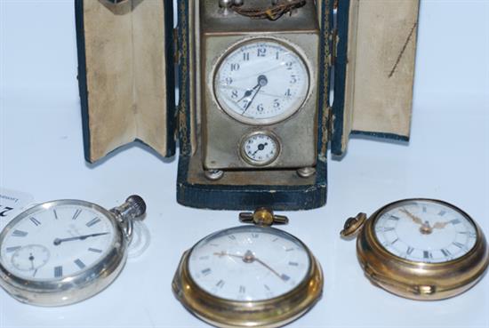 THREE OPEN FACE POCKET WATCHES INCLUDING PAIR CASED TOGETHER WITH A CASED CARRIAGE CLOCK