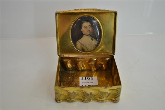 19TH CENTURY CONTINENTAL GILT METAL TRINKET BOX WITH INTERNAL HAND PAINTED MINIATURE PORTRAIT