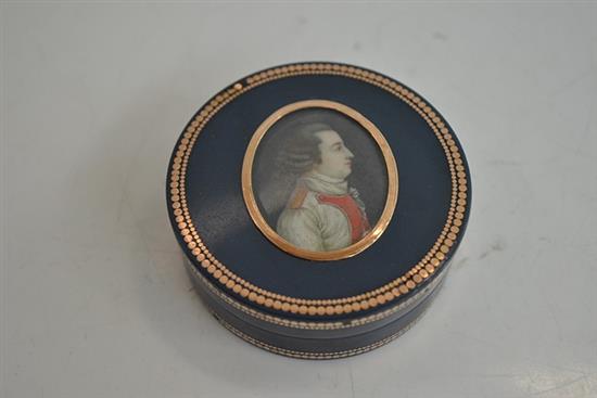 19TH CENTURY GOLD INLAID PLASTIC SNUFF BOX WITH INSET HAND PAINTED MINIATURE PORTRAIT AND FAUX TORTOISE SHELL INTERIOR