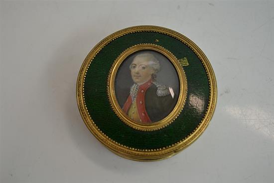 19TH CENTURY GILT MEAL MOUNTED SNUFF BOX WITH INSET HAND PAINTED MINIATURE PORTRAIT AND FAUX TORTOISE SHELL INTERIOR