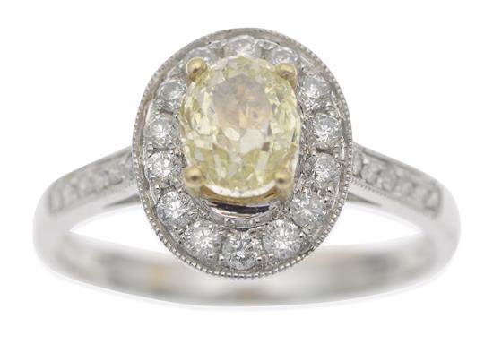 Of cluster design, centrally set with an oval fancy light yellow diamond weighing 0.60cts, within a border of round brilliant cut diamonds and diamond set shoulders, in 18ct white gold, ring size M-N.