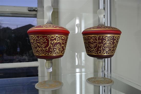A PAIR OF RUBY GLASS CASED HEAVILY GILDED COMPORTS