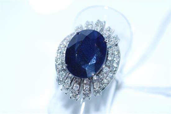 AN ART DECO STYLE SAPPHIRE AND DIAMOND RING IN 14CT GOLD