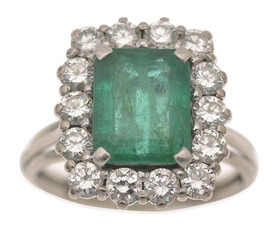 Of rectangular cluster design, centrally set with an emerald cut emerald weighing 1.90cts, within a border of round brilliant cut diamonds totalling 1.30cts, in 18ct white gold, ring size M-N.
