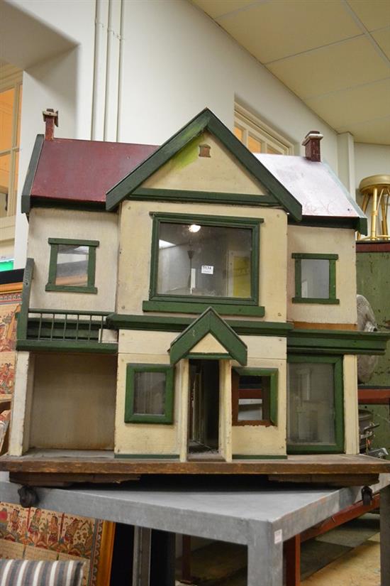 A VINTAGE DOLLS HOUSE MOUNTED ON CASTERS (AF)