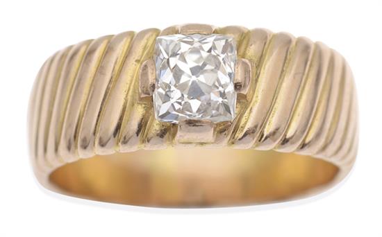 The old European rectangular cushion cut diamond weighing 1.15cts, claw set in a wide diagonally reeded band, in 14ct gold, ring size P-Q.