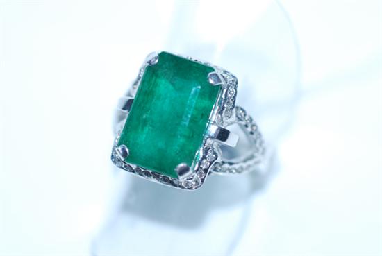 AN EMERALD AND DIAMOND DRESS RING IN 18CT WHITE GOLD