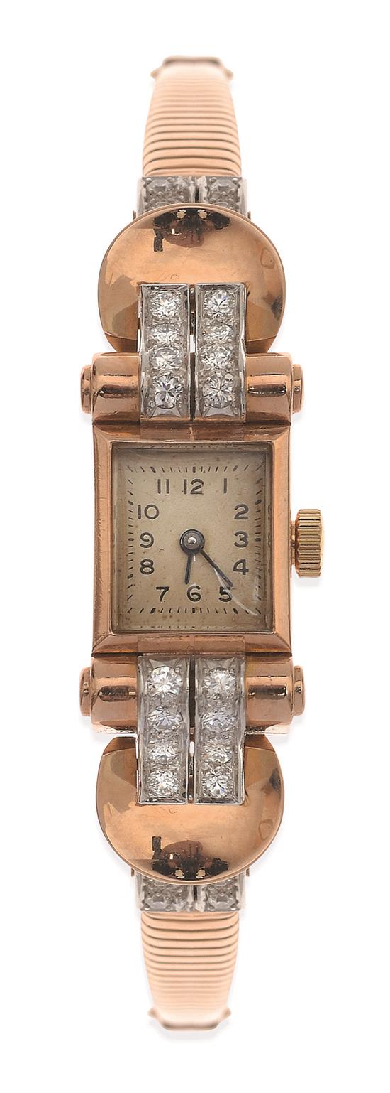 Manual wind movement, rectangular gilded dial with Arabic numerals, 14ct gold case with diamond detail, total weight 34.0gms, total length 160mm.