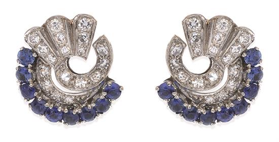 Of circular spray design, set with sapphires and single cut diamonds, to post and butterfly fittings, in platinum.