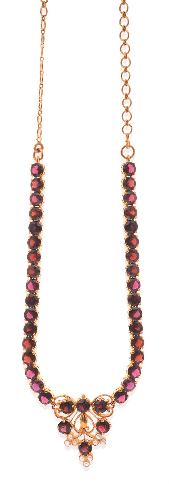 The riviere style necklace with claw set garnets and central scrolled pendant set with garnets and seed pearls, in 22ct gold, total length 400mm.