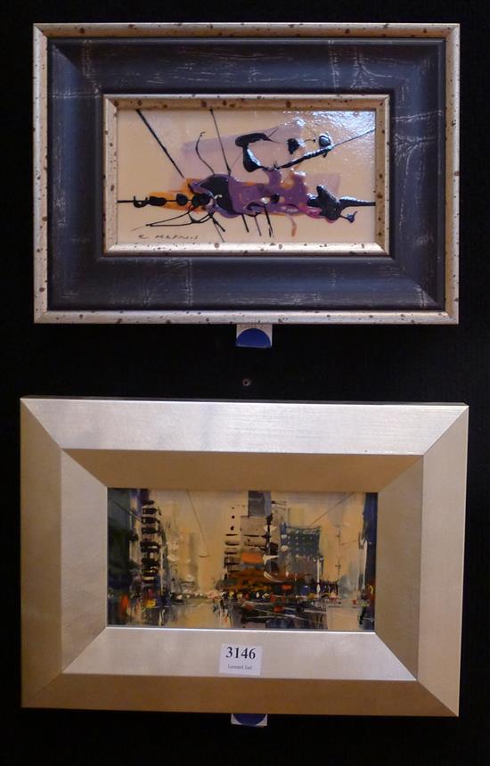 TWO KARLIS MEDNIS, WORKS ABSTRACT AND CITYSCAPE, OIL ON BOARD (2) 8.5 X 16CMS EACH