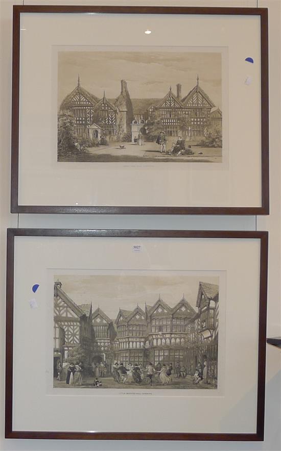 TWO ENGRAVINGS, LITTLE MORETON HALL, CHESHIRE AND GARDEN FRONT SPEKE, LANCASHIRE