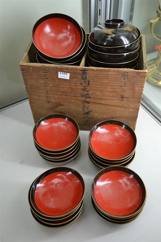 SET OF 20 JAPANESE LACQUER BOWLS WITH CRANE DECORATION