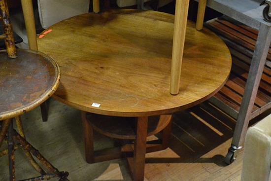 A CIRCULAR TOP HARDWOOD OCCASIONAL TABLE WITH SHELF