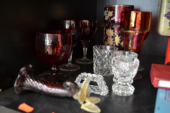 PART SHELF OF RUBY GLASS INCLUDING VICTORIAN FLORAL VASE, WINES ETC