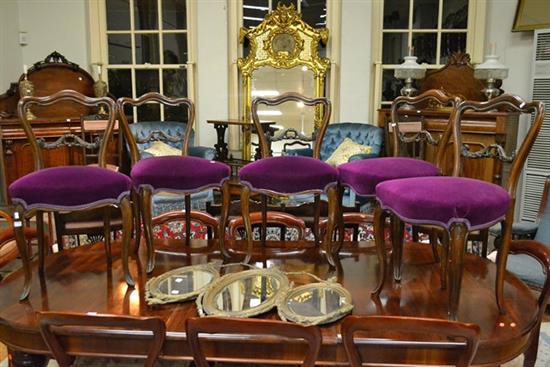 A SET OF FIVE VICTORIAN MAHOGANY CHAIRS IN PURPLE UPHOLSTERY