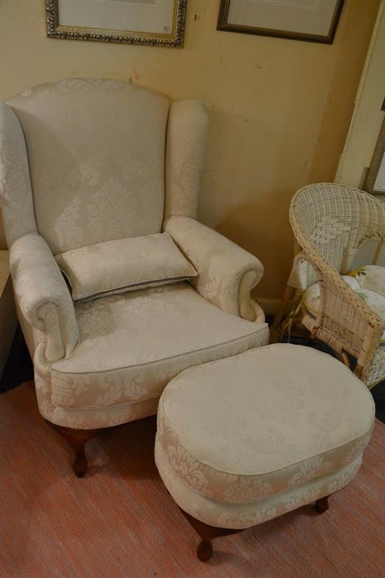 A PAIR OF SEMI WING BACK ARM CHAIRS IN CREAM UPHOLSTERY WITH MATCHING FOOT STOOL