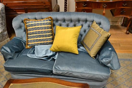 A FOUR PIECE CLASSICAL STYLE BUTTON BACK SOFA SUITE OF TWO SEATERS AND MATCHING ARM CHAIRS