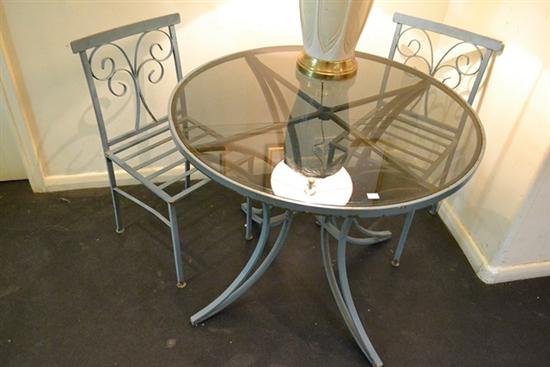 A CIRCULAR WROUGHT IRON TABLE WITH GLAZED TOP AND TWO MATCHING CHAIRS