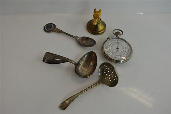 GILT BRONZE HOUND FINIAL, TWO EP SPOONS, CALLIGRAPHY POCKET MEASURING DEVICE AND GERMAN 800 SILVER CADDY SPOON
