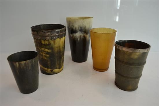 COLLECTION OF FIVE 19TH CENTURY AND LATER BEAKERS, INCLUDING SILVER PLATE MOUNTED