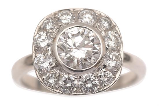 Of cluster design, centrally set with a round brilliant cut diamond weighing 1.20cts, within a border of twelve round brilliant cut diamonds, totalling 0.75cts, in 18ct white gold, independent valuation available, ring size O-P.