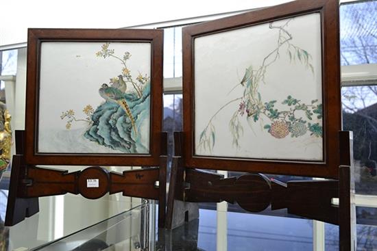 PAIR OF CHINESE ENAMELLED PORCELAIN TABLE SCREENS IN ROSEWOOD STANDS, DEPICTING GRASSHOPPER AND BIRDS