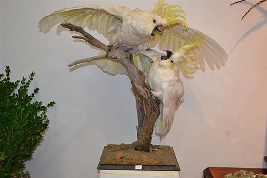 A PAIR OF TAXIDERMIED FIGHTING COCKATOOS MOUNTED ON A BRANCH