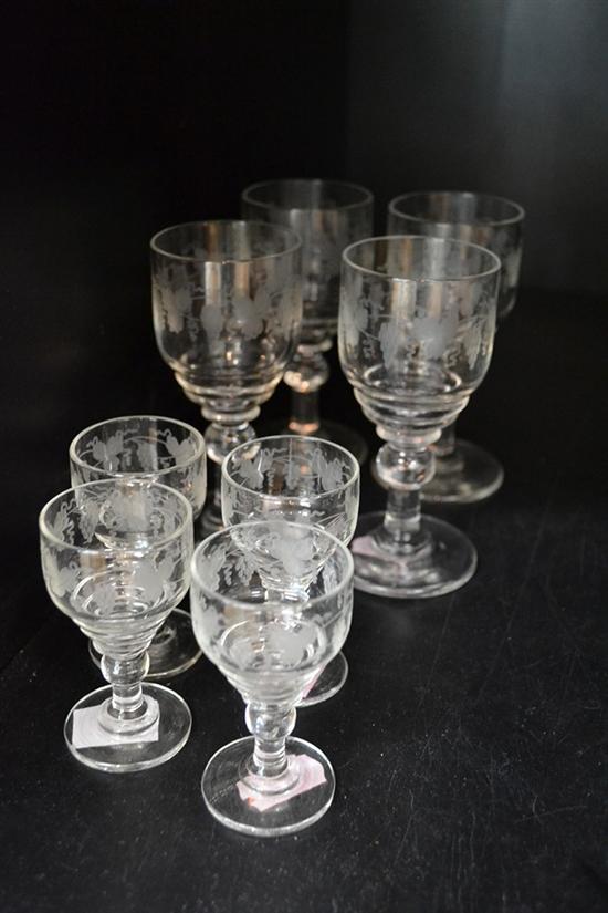 TWO SETS OF FOUR 19TH CENTURY ETCHED CRYSTAL LIQUEURS