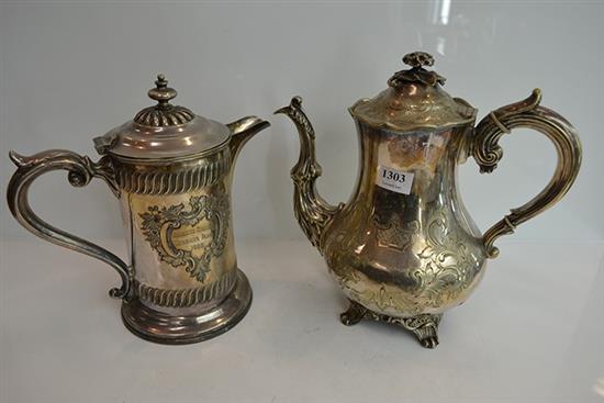 AN ORNATE EP TEAPOT WITH FLOWER FINIAL AND A EP LIDDED TANKARD, INSCRIBED 'GEELONG COLLEGE VETERANS PLATE 1900'