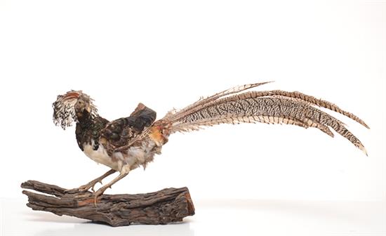 A JAPANESE CRESTED FOWL MOUNTED ON A LOG