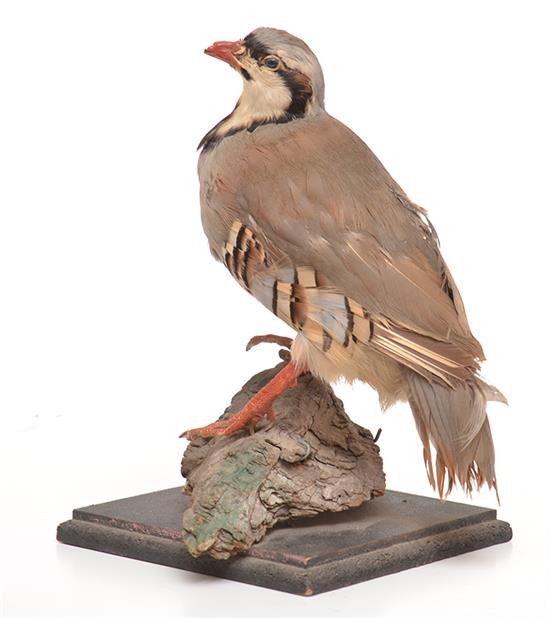 A TAXIDERMIED PARTRIDGE MOUNTED ON A LOG