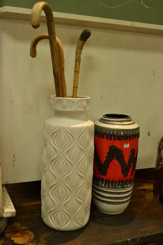 TWO WEST GERMAN CERAMIC VASES WITH THREE CANE WALKING STICKS