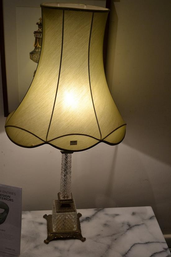 A PAIR OF CUT GLASS AND BRASS LAMPS WITH GREEN SHADE