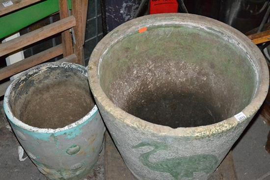 A 1980'S ABORIGINAL HUNTER PLANTER AND A 1950'S CONCRETE CYLINDER POT