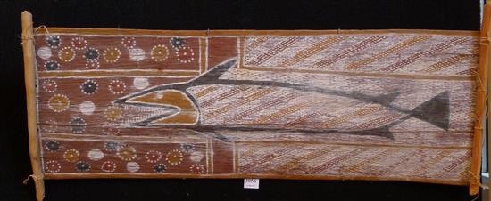 A BARK PAINTING DEPICTING TRADITIONAL DESIGNS AND FISH