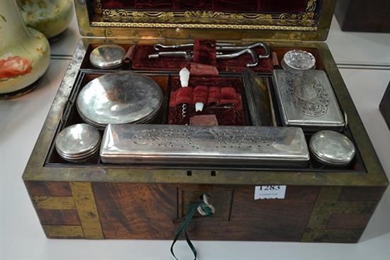 VICTORIAN BRASS BOUND BURR WALNUT VANITY BOX WITH SILVER PLATE MOUNTED JARS