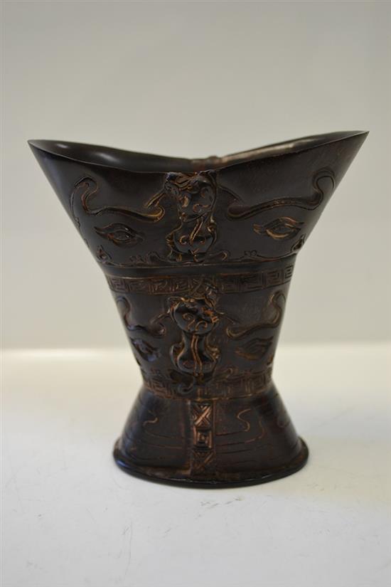 CHINESE CARVED HORN FOOTED LIBATION CUP