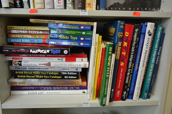 ONE SHELF OF COLLECTORS REFERENCE INCL PHONOGRAPHS, TOYS, RADIOS ETC