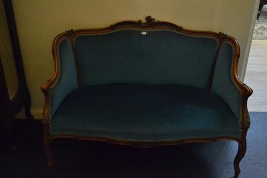 A LOUIS XV STYLE TWO SEATER SETTEE IN TEAL VELVET