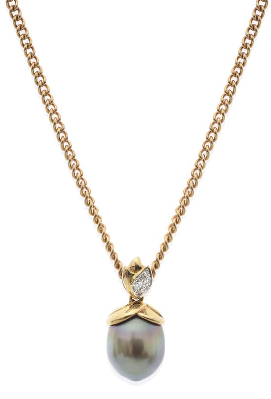 Comprising an oval pearl of grey green hues, measuring 13.12mm with a scalloped cap, suspended on an articulated diamond set bale in 18ct gold, on a curblink chain in 9ct gold.