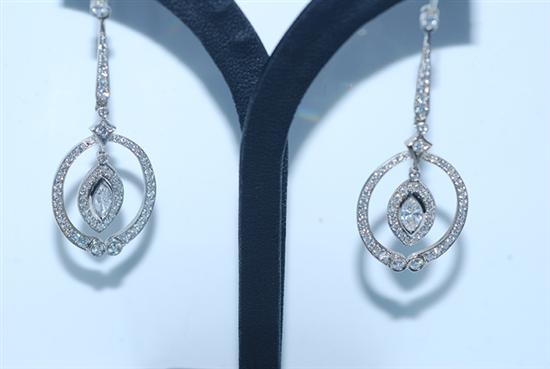 Each earring comprising an open circular diamond set drop centred with an articulated marquise shaped diamond cluster, suspended on a vertical diamond set drop on shepherd hook fittings, in 18ct white gold