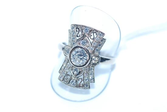 The bow shaped pierced plaque, centrally set with an old European cut diamond weighing 0.85cts, within a diamond set surround in millegrain decoration, in 18ct white gold ring size P-Q.