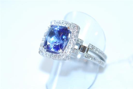Of square cluster design, centrally set with a cushion cut tanzanite weighing 5.0cts, claw set within a border of round brilliant cut diamonds, in split diamond set shoulders, in 18ct white gold, independent valuation available, ring size O-P.