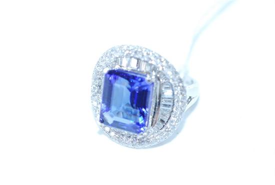 Of cluster design, centrally set with an emerald cut tanzanite weighing 9.76cts, within a surround of tapered baguette cut diamonds and an outer double row of round brilliant cut diamonds, in 18ct white gold, independent valuation available, ring size M-N.