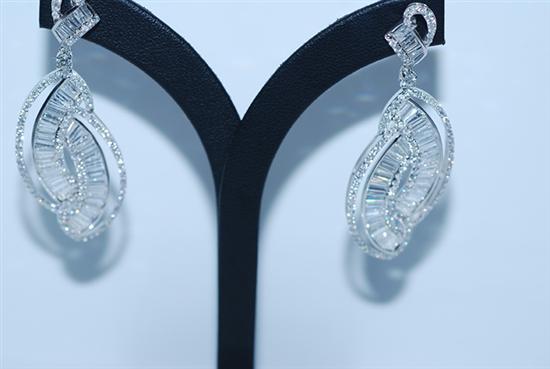 Each earring comprising marquise shaped drops set with baguette and round brilliant cut diamonds, to a conforming stud fitting, altogether totalling 7.95cts, in 18ct white gold, independent valuation available.
