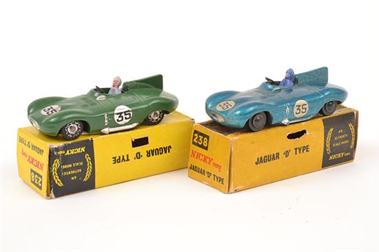 TWO NICKY 238 JAGUAR D-TYPE MODELS, ONE RACING GREEN, ONE METALLIC BLUE (E-VG BOXES F-G) (2)
