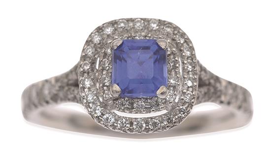 Of cluster design, centrally set with a square emerald cut sapphire weighing 0.60cts, within a double border of round brilliant cut diamonds and diamond set shoulders, in 18ct white gold, ring size J-K.