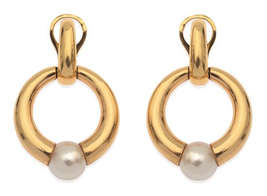 Each earring comprising an open circular drop with cultured pearl feature, serial number D78891, to post and clip fittings, in 18ct gold, circa 1994, boxed.